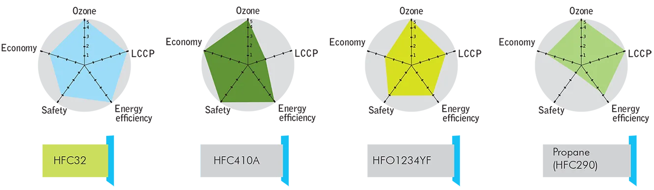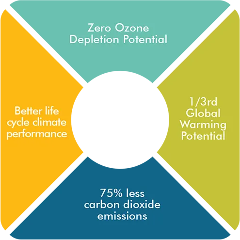R-32 has zero Ozone Depletion Potential (ODP) and Modified Global. Warming Potential (GWP) of 472, compared to R-410A’s Modified GWP of 2,027. Also R-32 is a single component refrigerant, which makes it easy to recycle. It is because of these reasons that R-32 offers the lowest total emissions and best overall life-cycle climate performance.