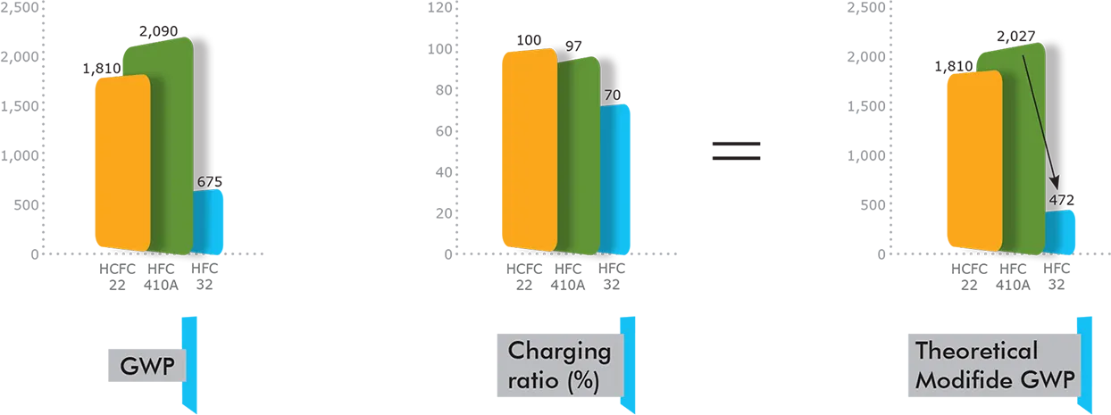 R-32 has zero Ozone Depletion Potential (ODP) and Modified Global. Warming Potential (GWP) of 472, compared to R-410A’s Modified GWP of 2,027. Also R-32 is a single component refrigerant, which makes it easy to recycle. It is because of these reasons that R-32 offers the lowest total emissions and best overall life-cycle climate performance.